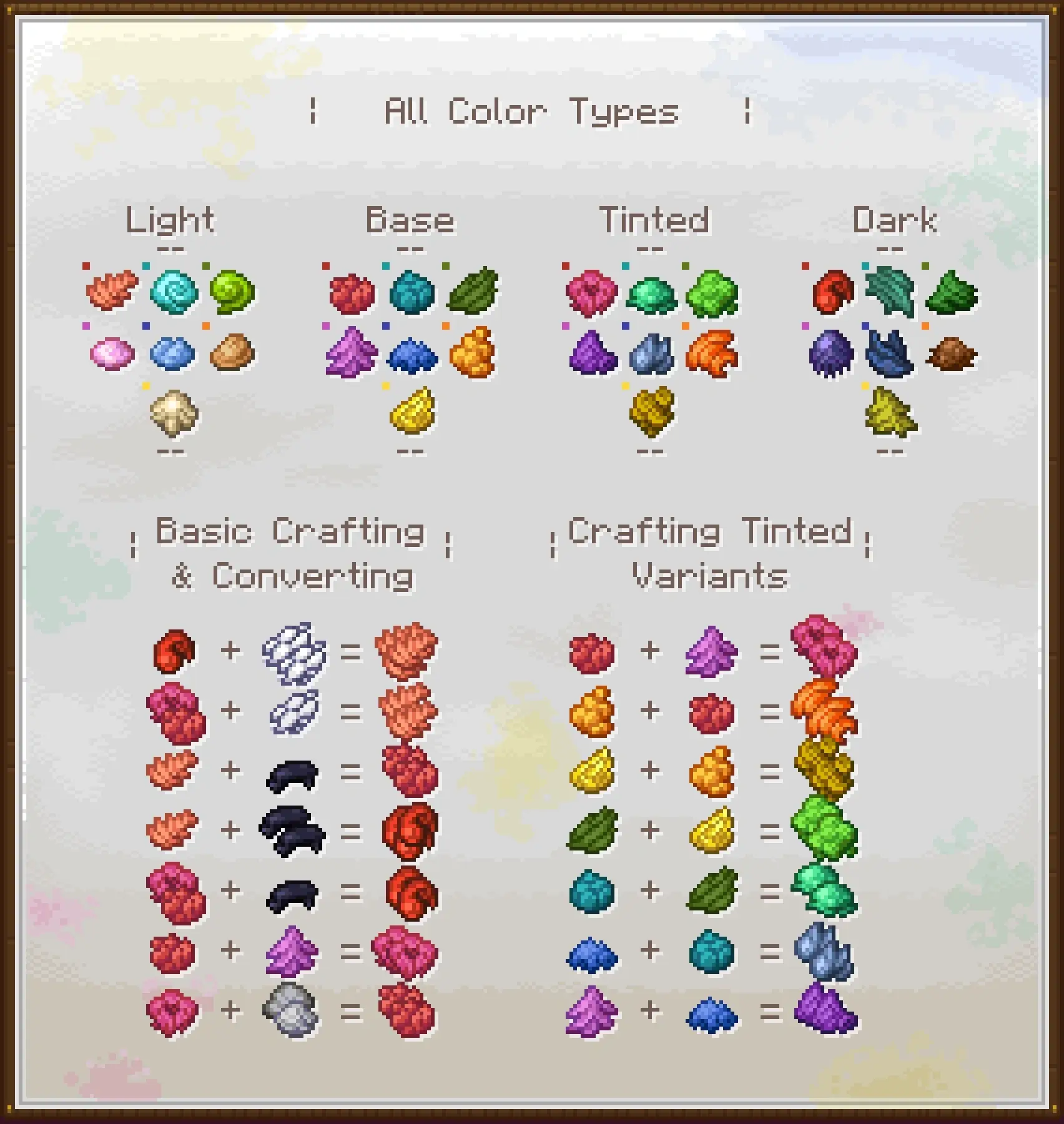 И, наконец, в игру добавлен встроенный дополнительный набор ресурсов, который еще больше улучшает цвета, превращая голубой в небесный, светло-серый в пепельный и улучшая текстуру предметов, окрашенных ванильным красителем.