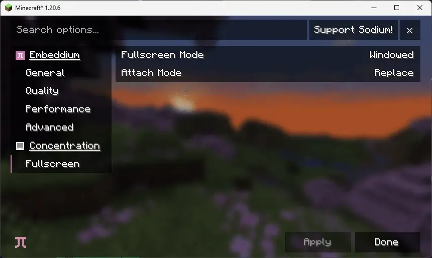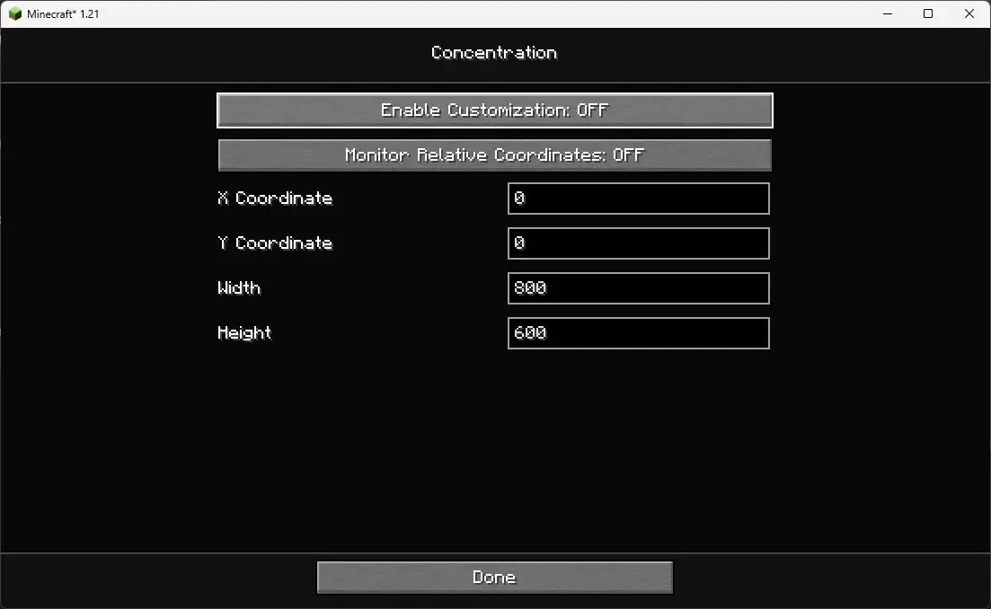Concentration 1.21.1 / 1.20.6 01 янв,2026 Concentration - добавляет полноэкранный режим без полей для Minecraft 1.20.6+