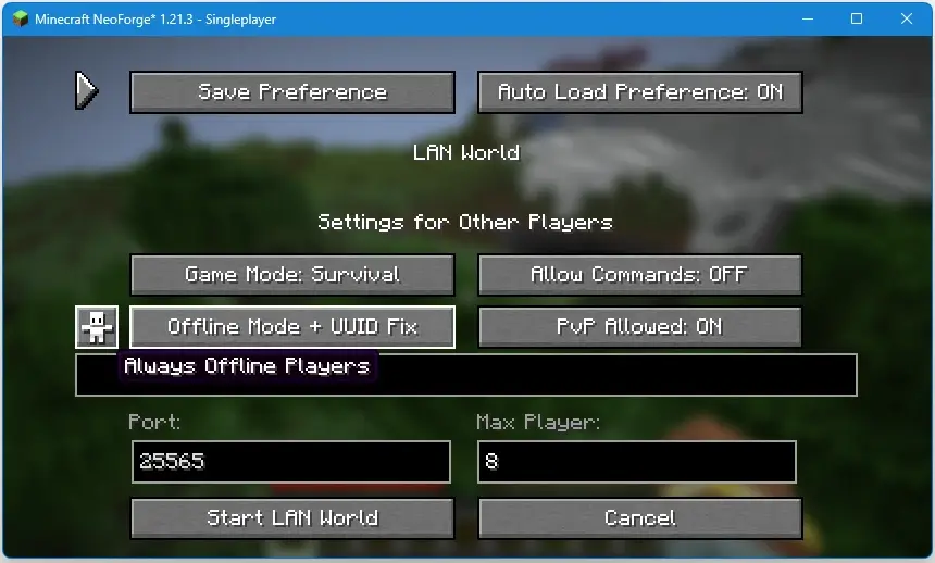 LAN Server Properties - добавляет несколько новых функций в графический интерфейс "Open to LAN", который затем позволит пользователю запускать игру по локальной сети на определенном порту, а также предоставит возможность отключить "онлайн-режим".