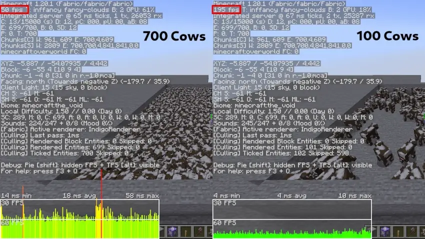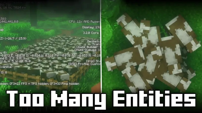 Too Many Entities - позволяет вам скрывать дополнительные объекты, чтобы уменьшить нагрузку, особенно в случае с фермами мобов. Мобы все еще существуют в мире, просто их не видно. Чтобы использовать мод, вам сначала нужно настроить максимальное ограничение для объектов (которое может быть установлено для каждого типа объектов или глобально). По умолчанию это значение равно 64. Если для параметра entity limit установлено значение 64 и оно применяется глобально, то мод не позволит отображать более 64 объектов одного типа одновременно. Вы также можете указать ограничение для каждого типа объекта, например, ограничение в 5 коров, что означает, что на экране всегда будет отображаться не более 5 коров. Это особенно полезно для ферм мобов, где у вас может быть до сотни объектов, которые необязательно должны быть видны, и их скрытие может значительно увеличить FPS в зависимости от того, сколько объектов там было.